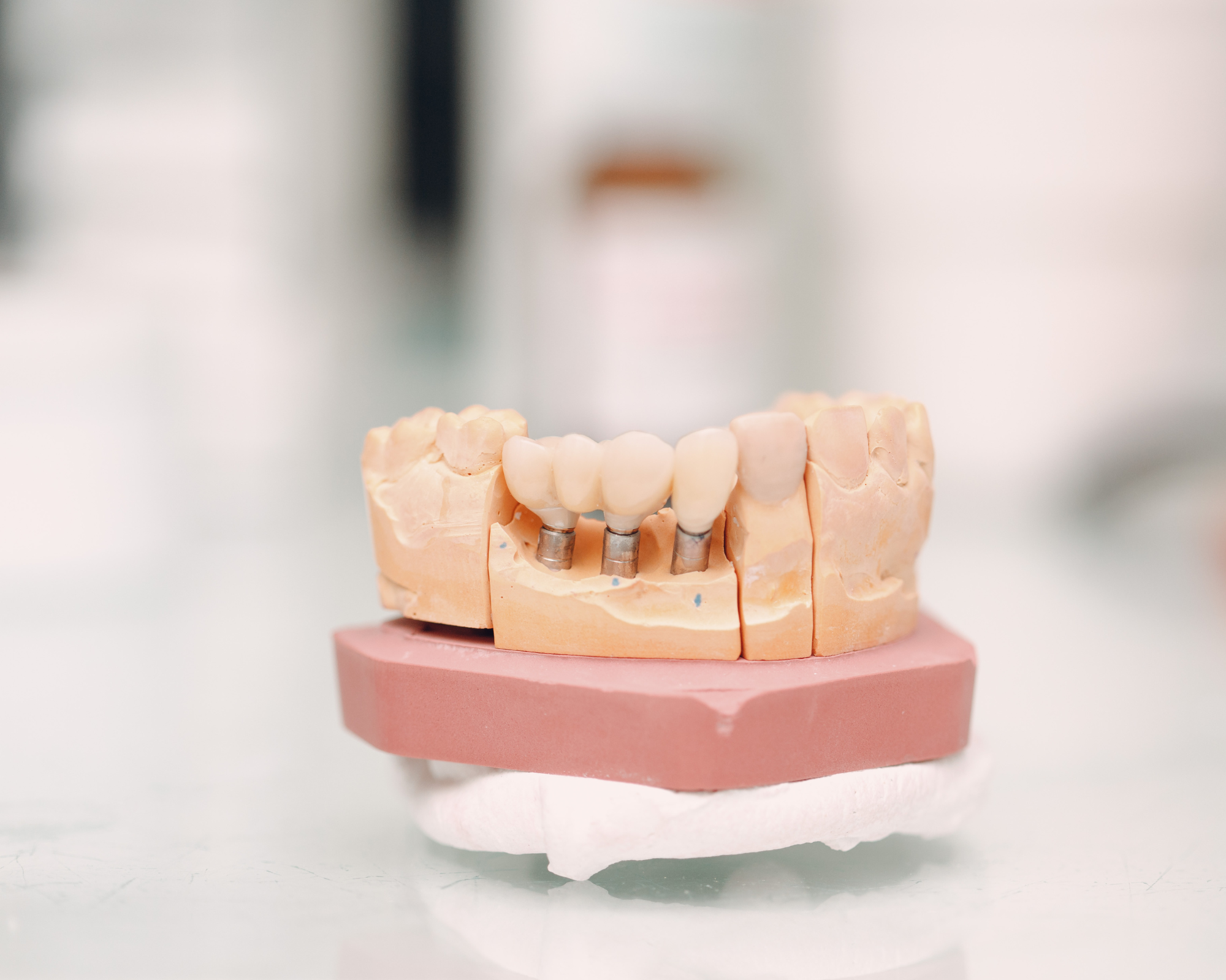 隣り合う歯が複数本失われた場合に、数本のインプラントを支えにして、ブリッジ型の人工歯を装着します。