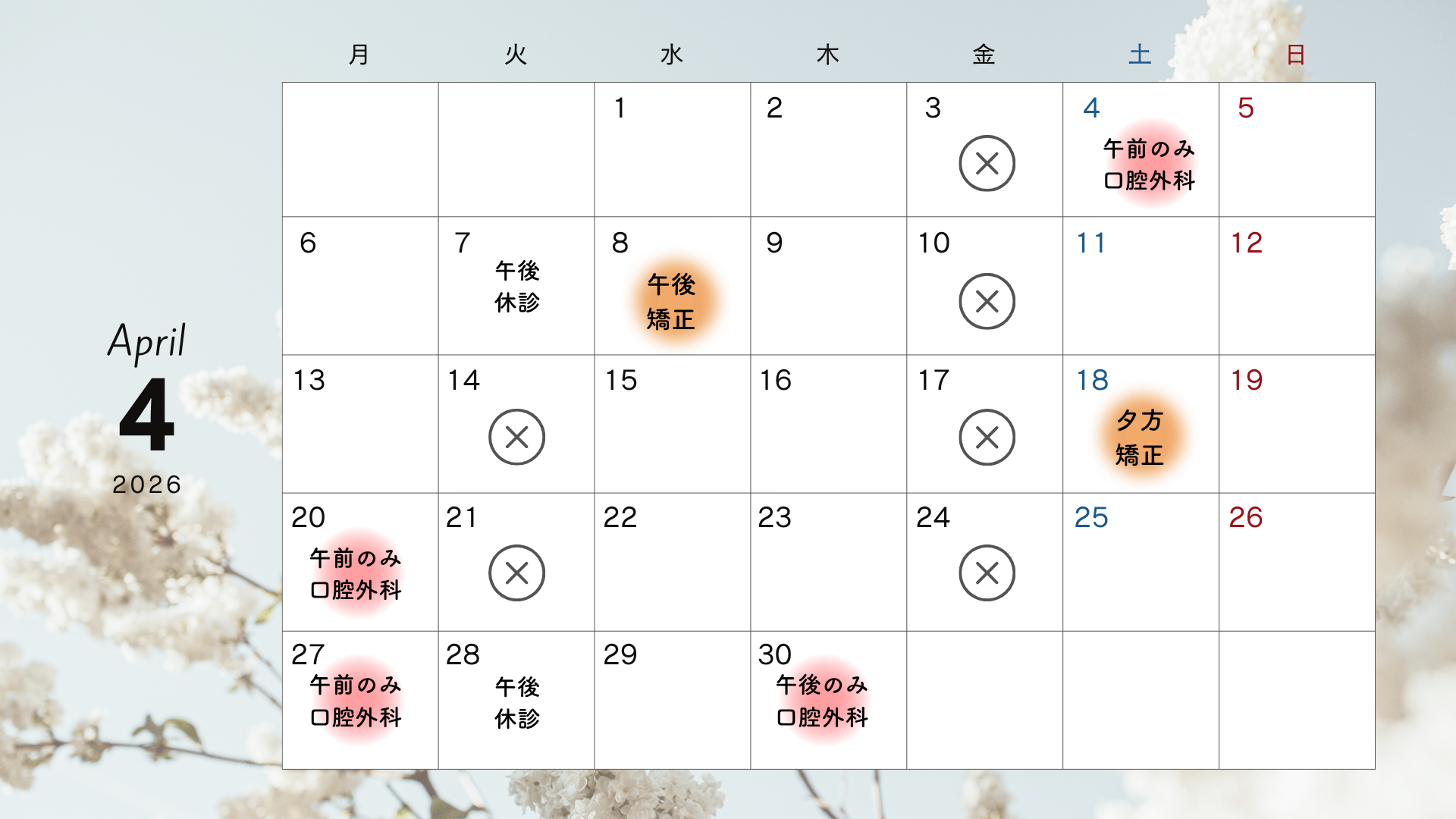 初診のご予約は、現在2週間程度お待ちいただく場合がございます。そのため、4月は診療日を一部追加し対応いたします。